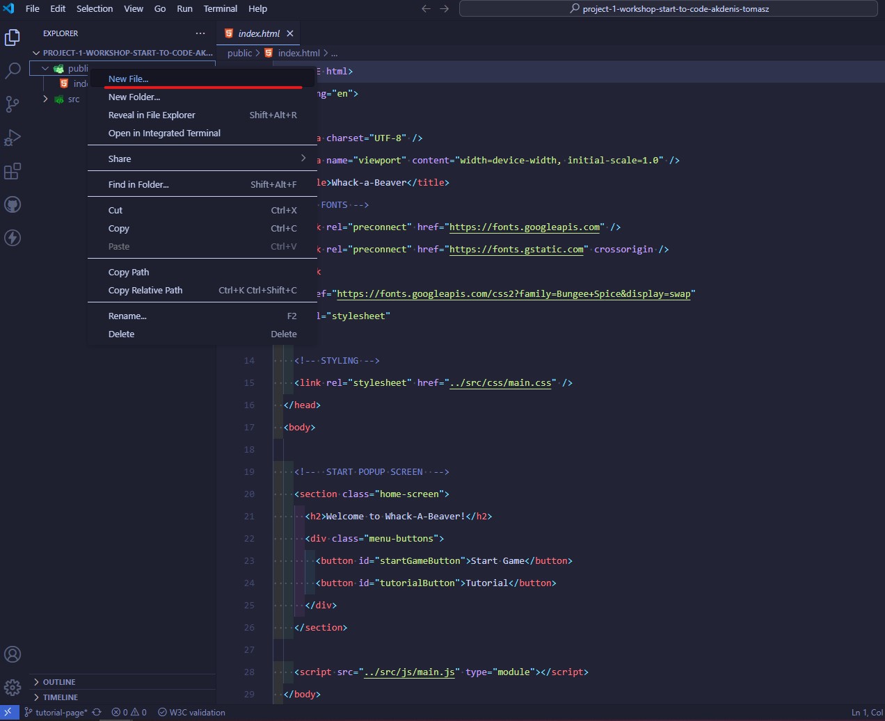 Aller eerst moet je een nieuw HTML bestand aanmaken. Dat doe je door je public filder te selecteren, rechter muisklik en "new file" aan te klikken.