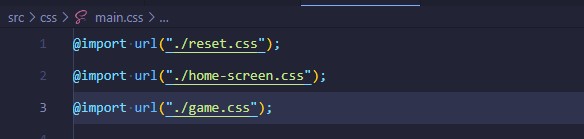 In je "main.css" bestand zal je die ook moeten importeren door: "@import url("./game.css");" toe te voegen.