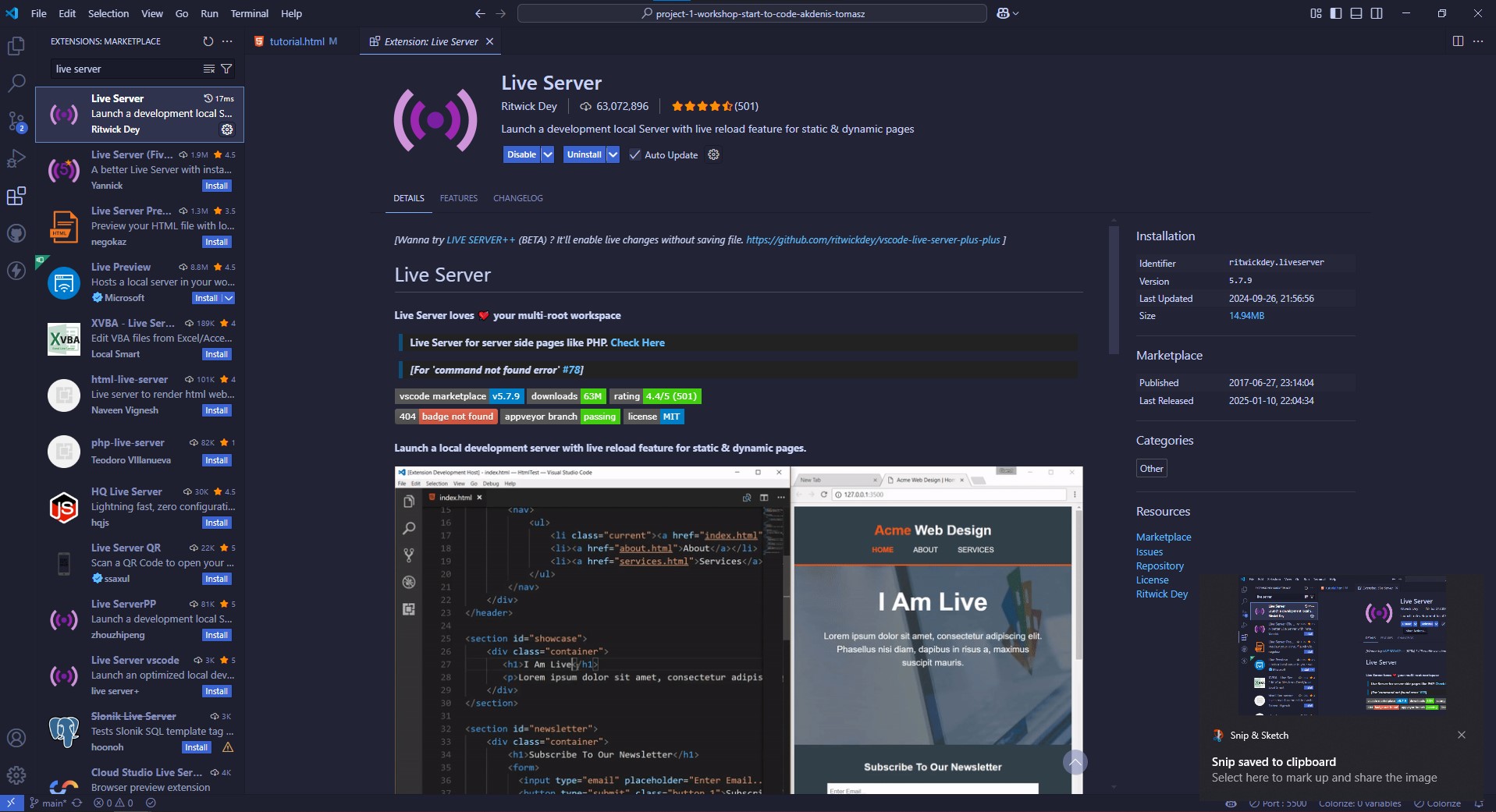 Installeer de live server extensie in Visual Studio Code; die ziet er zo uit: